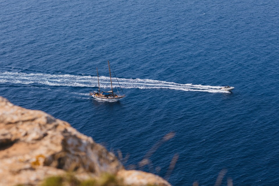 Irgendwie möchte ich ja schon gerne näher ran. Näher an die Felsen, um die Steinwand und das Meer darunter zu sehen. Es reizt mich, wenn da nicht die Gänsehaut, der kalte Schweiss und der Panikausbruch gewesen wären, die mich allesamt davon abhielten, an den Abgrund zu gehen. Seien wir doch mal ehrlich, nach den Felsen einer Steilküste ist der Abgrund und das flößt mir in Verbindung mit Wind in jedem Fall weiche Knie und ein mehr wie mulmiges Gefühl ein. Was, wenn du jetzt ungünstig auf eine Felskante trittst oder gar dabei abrutscht? Dann gibt’s definitiv kein After Wedding mehr. Da tröstet es mich, wenn der Bräutigam zu mir sagt „Na, bei uns ist das nicht so tragisch, wenn einer fällt. Wir haben ne‘ Lebensversicherung.“ Das macht Mut. Vor allem wenn man keine hat. Also stand ich da, mit zittrigen und weichen Beinen, der Wind flog mir durch die Haare und ich klammerte mich am Arm des Bräutigams fest, um das Motorboot und das Segelschiff zu fotografieren. Genau einmal, für ein Foto.