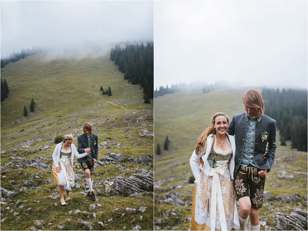 Schliersee, Spitzingsattel, Alm, Berge & Kuhglocken. Ein Traum! Der Tag begann für mich, als Hochzeitsfotografin Schliersee mit einer Shuttlefahrt auf die Obere Firstalm. Dort angekommen, bezog ich mein Zimmer und war überwältigt von der schönen Landschaft um die Firstalm. Kurz nach den ersten Loctionfotos ging’s für mich, als auch die Gäste & Michi direkt zum Shuttlebus, der uns zur Kapelle nach Schliersee fuhr. Die kirchliche Trauung fand in der Kapelle St. Georg am Weinberg über dem Schliersee statt. Eine süße kleine Kirche. Viel Platz hat man dort wahrlich nicht, aber für die familiäre & romantische Hochzeit von Michi & Corinna war die Kapelle perfekt. Nach der Trauung hatten Corinna & Michi für den Sektempfang einen Bollerwagen organisiert und eine kleine Wanderung auf die Obere Firstalm geplant. Der Bollerwagen war gefüllt mit Obst, Süßigkeiten für die Kleinen, Getränken aller Art und „Deftigem“ als Wegzehrung für die Wanderung. Wir machten zwischenzeitlich immer wieder Pause. Während der Wanderung begegneten uns noch Musiker, die meinem Brautpaar spontan ein Ständchen hielten. Nach etwa einer Stunde erreichten wir die Obere Firstalm bei leider nicht mehr ganz so schönem Wetter wie am Morgen. Es sollte regnen, Nebel zog bereits auf und ein frisches „Lüftchen“ zog auch bereits. Nach Kaffee & Kuchen sowie Gruppenfotos musste ich für die Brautpaarportraits mit den beiden einfach inmitten in die „Pampa“ und das sensationelle Bergpanorama mit Nebel als Hintergrund nutzen! Es war eine wunderschöne Feier, wir haben alle sehr viel gelacht, gut gegessen und ausgelassen gefeiert. Aber seht einfach selbst…