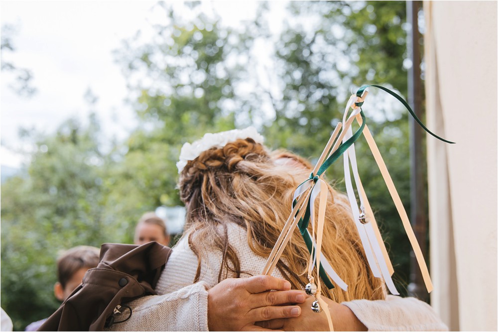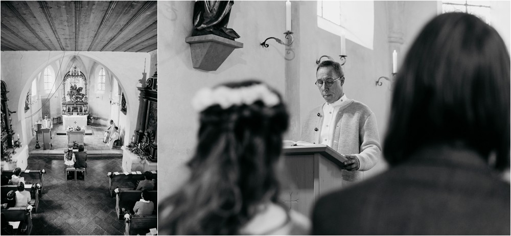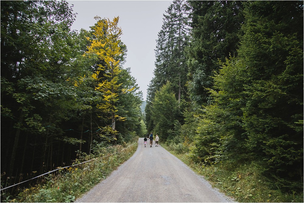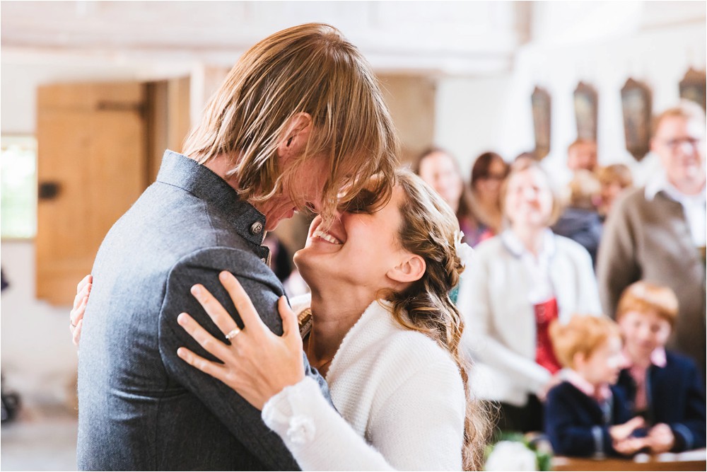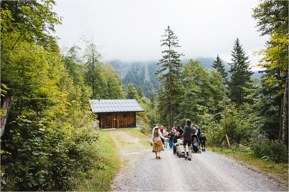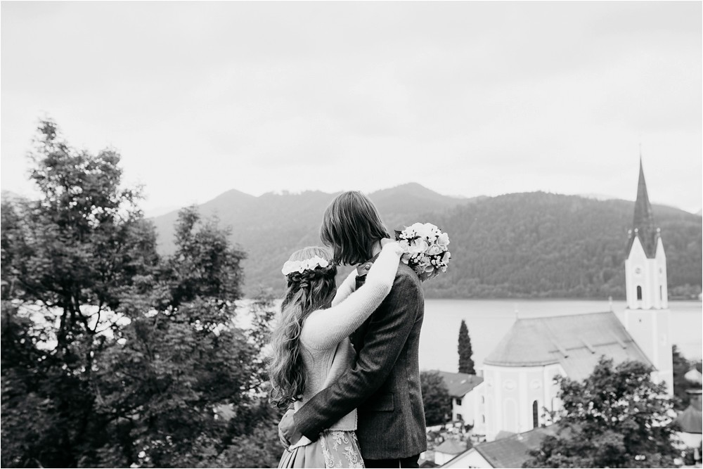 Schliersee, Spitzingsattel, Alm, Berge & Kuhglocken. Ein Traum! Der Tag begann für mich, als Hochzeitsfotografin Schliersee mit einer Shuttlefahrt auf die Obere Firstalm. Dort angekommen, bezog ich mein Zimmer und war überwältigt von der schönen Landschaft um die Firstalm. Kurz nach den ersten Loctionfotos ging’s für mich, als auch die Gäste & Michi direkt zum Shuttlebus, der uns zur Kapelle nach Schliersee fuhr. Die kirchliche Trauung fand in der Kapelle St. Georg am Weinberg über dem Schliersee statt. Eine süße kleine Kirche. Viel Platz hat man dort wahrlich nicht, aber für die familiäre & romantische Hochzeit von Michi & Corinna war die Kapelle perfekt. Nach der Trauung hatten Corinna & Michi für den Sektempfang einen Bollerwagen organisiert und eine kleine Wanderung auf die Obere Firstalm geplant. Der Bollerwagen war gefüllt mit Obst, Süßigkeiten für die Kleinen, Getränken aller Art und „Deftigem“ als Wegzehrung für die Wanderung. Wir machten zwischenzeitlich immer wieder Pause. Während der Wanderung begegneten uns noch Musiker, die meinem Brautpaar spontan ein Ständchen hielten. Nach etwa einer Stunde erreichten wir die Obere Firstalm bei leider nicht mehr ganz so schönem Wetter wie am Morgen. Es sollte regnen, Nebel zog bereits auf und ein frisches „Lüftchen“ zog auch bereits. Nach Kaffee & Kuchen sowie Gruppenfotos musste ich für die Brautpaarportraits mit den beiden einfach inmitten in die „Pampa“ und das sensationelle Bergpanorama mit Nebel als Hintergrund nutzen! Es war eine wunderschöne Feier, wir haben alle sehr viel gelacht, gut gegessen und ausgelassen gefeiert. Aber seht einfach selbst…