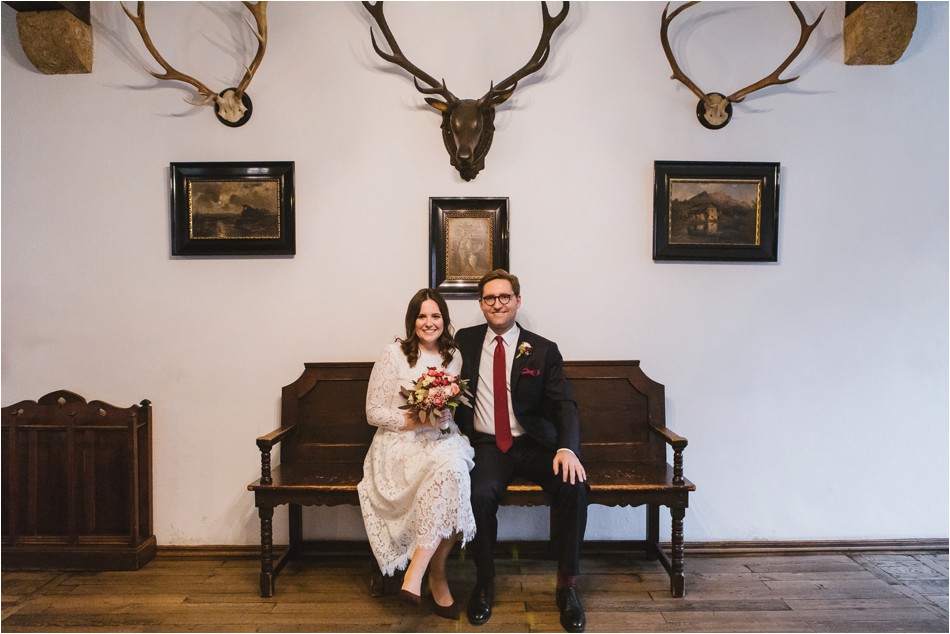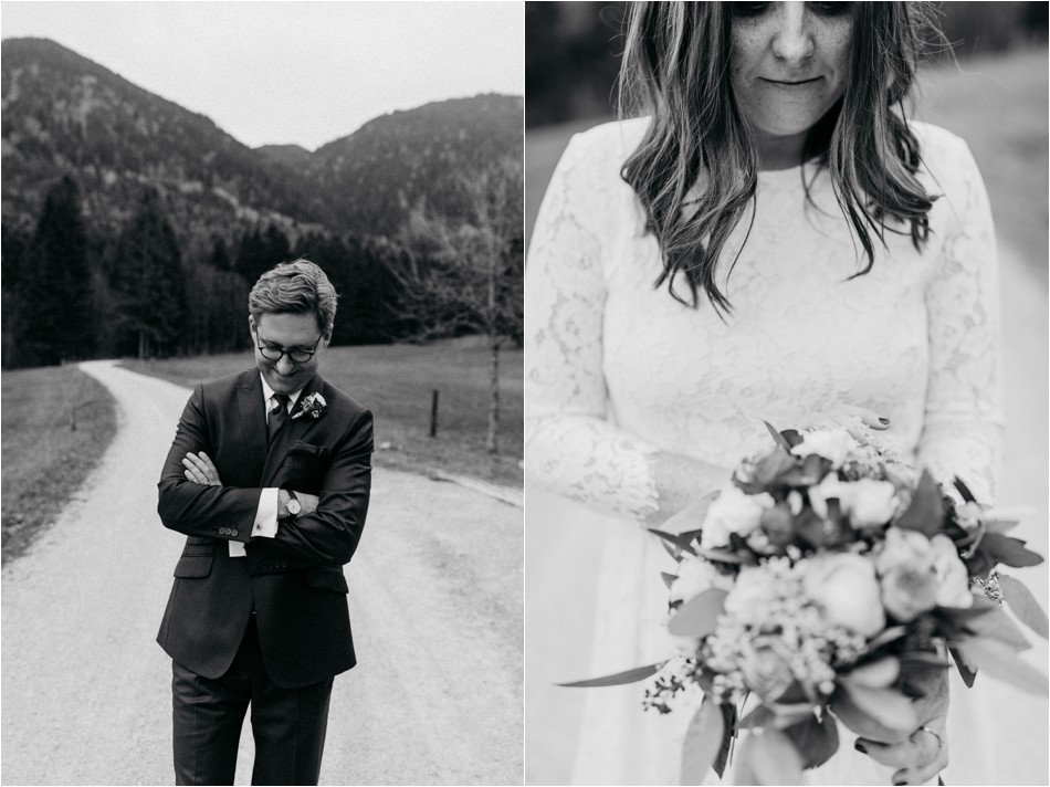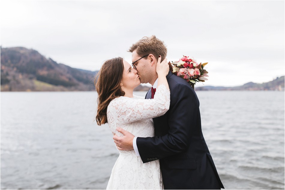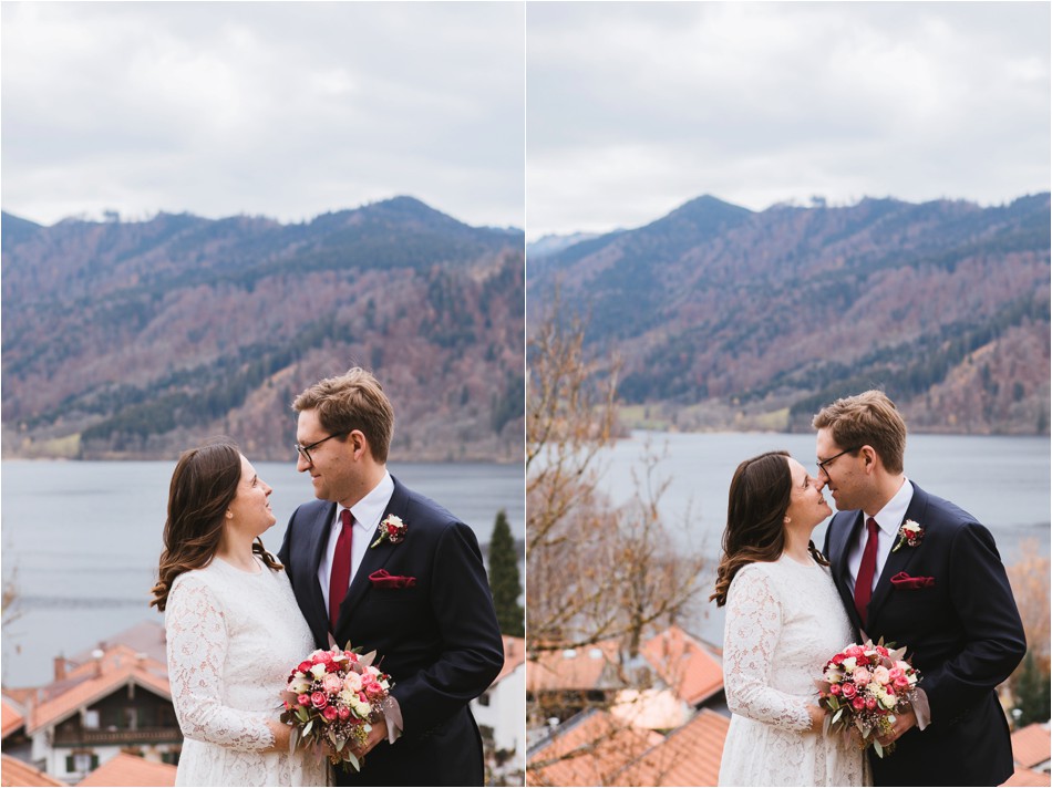 Seit ein paar Wochen sind K & J verheiratet. Die beiden gaben sich am schönen Schliersee das JA Wort, im engsten Kreis der Familie und ihrer Freunde. Eine superschöne, kleine familiäre Hochzeit in Schliersee mit anschließender Feier im Das Tegernsee am Tegernsee. Ich erreichte Schliersee bei noch strahlendem Sonnenschein, mit jedoch einigen aufziehenden Wolken. Das Wetter zeigte uns jedoch im Laufe unserer gemeinsamen Zeit leider noch die schlechtere Seite – aber dazu später mehr. Die standesamtliche Trauung fand im wunderschönen Rathaus von Schliersee statt, direkt danach ging’s hoch hinaus zu Fuß zur St. Georg Kapelle auf dem Weinberg zum Sektempfang. Die Wolken zogen immer mehr zu und der Wind wehte durch die Haare der Braut. Die Laune ließen wir uns von den frischeren Temperaturen und dem Wind jedoch keineswegs verderben. Mit vielen Rosenblättern und dem ein oder anderen Glas Sekt wurde dann auf das Brautpaar angestoßen. Im Anschluss daran fuhren wir zum Schliersee und ins Josefsthal für die Fotos. Das Wetter direkt am Schliersee war ziemlich rau und ungemütlich. Aber doch eigentlich recht passend für die beiden, da sie kürzlich in den hohen Norden gezogen sind. Letztlich blieben wir von Regen verschont, sodass wir zum Abschluss noch in Das Tegernsee gefahren sind, um dort die Feier fortzuführen.
